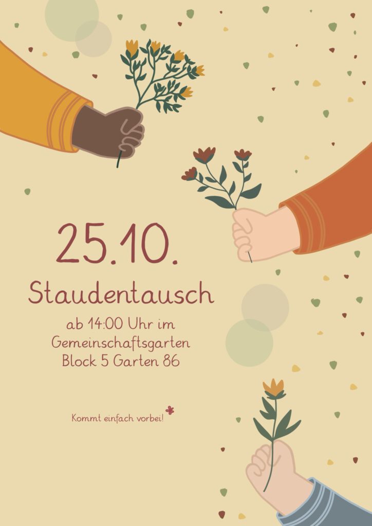 Am 25.10.25 könnt Ihr ab 10 Uhr bei der Pflege der Außenhecke von Block 4 mithelfen. Im Anschluss findet ab 14 Uhr ein Staudentausch im Vereinsgarten statt. Einfach Stauden mitbringen, die Ihr nicht mehr benötigt!